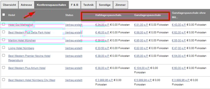 Neben der allgemeinen Hotelübersicht bietet die das Tool auch eine spezielle Ansicht, in der Du deine verhandelte Leistungen für jedes Hotels einsehen kannst. Diese Übersicht zeigt Dir detailliert, welche Konditionen Raten für bestimmte Konditionen angeboten wurden, und Du kannst sie direkt miteinander vergleichen.