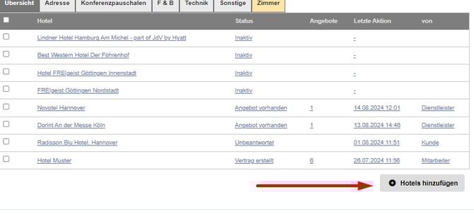 Falls Du ein neues Hotel zu deiner Ausschreibung hinzufügen möchtest, kannst Du dies ganz einfach über die Funktion "Hotels hinzufügen" machen. Vorab musst du bitte überprüfen, ob die Ausschreibefrist noch läuft. Sollte diese abgelaufen sein, musst du lediglich dem Partner Management vom MICE Portal ....@mice.com eine E-Mail schreiben mit deinem gewünschten Datum. Anschließend ist das Hotel sofort in deiner Übersicht sichtbar und du kannst mit deiner Verhandlung beginnen.