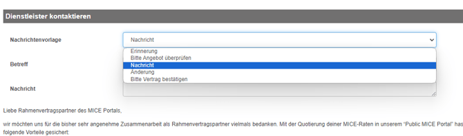 Das Verhandlungs-Tool bietet Dir auch die Möglichkeit, direkt mit den Hotels in Kontakt zu treten. Über die Auswahlfunktion kannst Du entweder einzelne Hotels oder alle gleichzeitig kontaktieren, was die viel Zeit erspart. Für sogenannte "Routine-E-Mails" haben wir bereits E-Mail-Vorlagen für Dich hinterlegt. Diese Vorlagen umfassen E-Mails wie z.B.