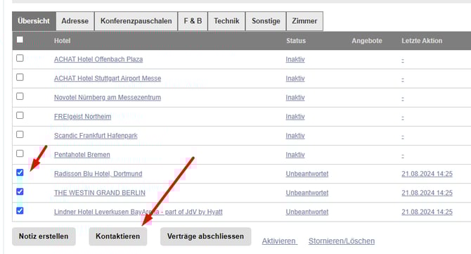 Inaktiv: Dieser Filter zeigt, dass das Hotel noch nicht aktiv ist oder die Verhandlungen noch nicht begonnen haben. Um das Hotel zu aktivieren, markiere es und klicke auf den Button "Aktivieren". Das Hotel erhält anschließend automatisch eine Einladung per E-Mail.