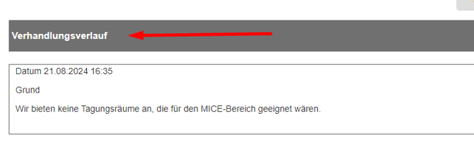 Abgelehnt: Dieser Filter zeigt alle Angebote an, die vom Hotel abgelehnt wurden. Die Gründe für die Ablehnung findest du im jeweiligen Einzelvertrag der Hotelverhandlungen. Um den Einzelvertrag aufzurufen, wähle zunächst das gewünschte Hotel aus. Daraufhin werden dir sämtliche Informationen zu diesem Hotel und der entsprechenden Ausschreibung angezeigt. Scrolle anschließend nach unten zum Abschnitt " Verhandlungsverlauf". Dort findest du den Grund für die Ablehnung.
