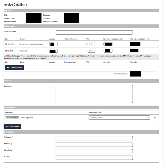 Tip: Always try to submit the actual costs as soon as possible after the event concludes. The invoice creation process from the MICE Portal is not dependent on this and continues as usual. If an invoice has already been created, actual costs can no longer be recorded.